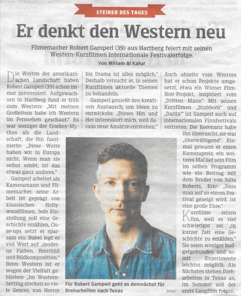 In addition to Westerns, he has already realized projects in other genres, including a Vienna-based film noir project inspired by The Third Man. With his short films Stubborn and Darlin’, Gamperl has also been represented at international film festivals. The response surprised him and was overwhelming. On one occasion, he won a cinematography award; on another, his film screened in the same festival program as a contribution by Eric Roberts, the brother of Julia Roberts—an experience he describes as a great honor.